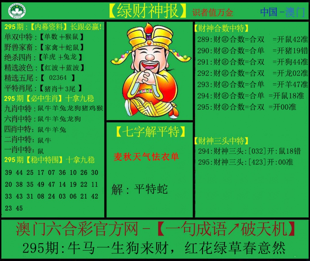 295期:澳门六合彩彩圖信封【绿财神报】每期自动更新
